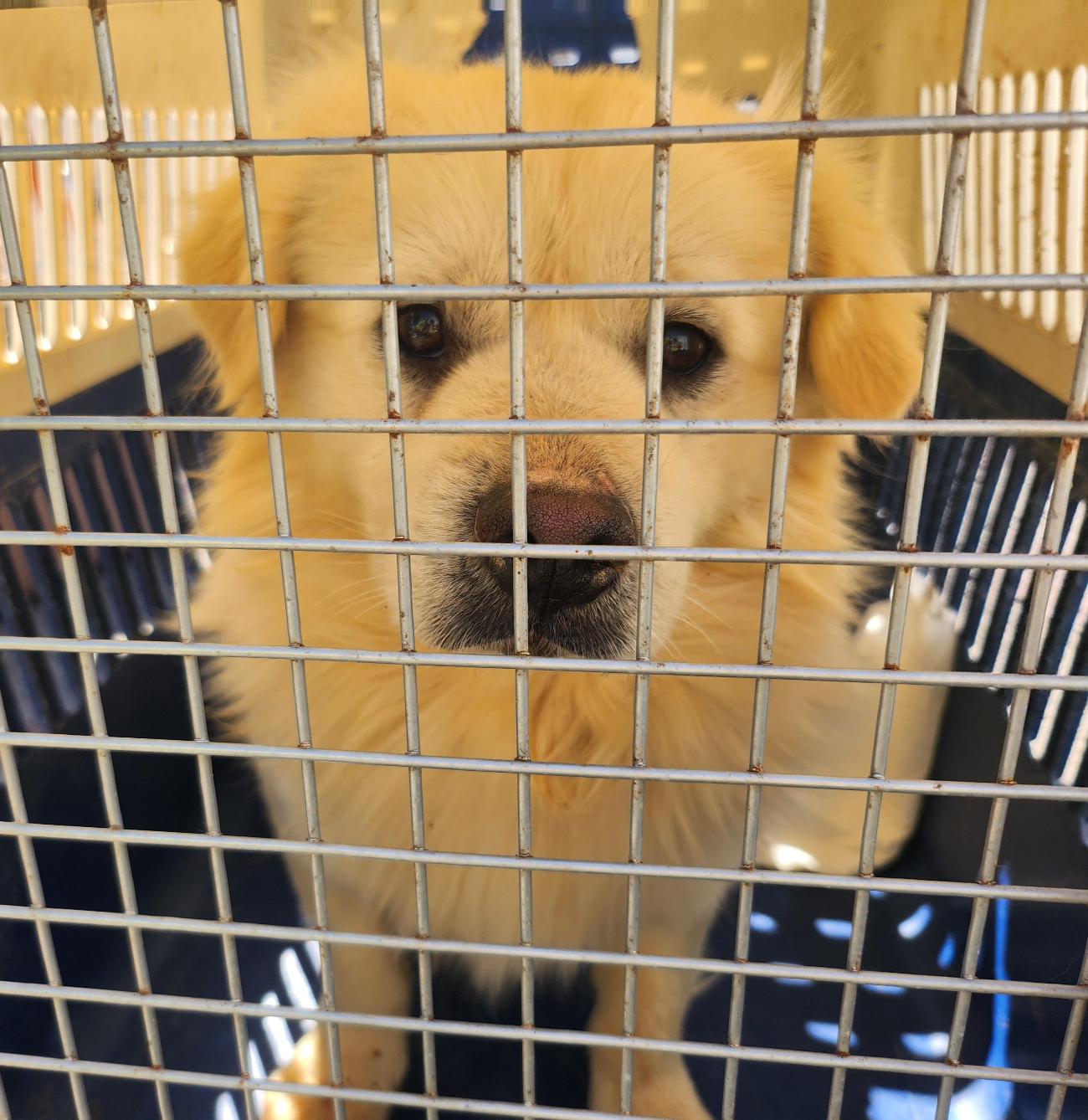• 특징: 애니멀호더 구조견, 소심하고 겁이 많은 편. 철창 속 노란 털 강아지. 털은 깨끗하나 다소 푸석하고 손질 부족. 푸른 매트 위에 앉아 간절하고 불안한 눈빛으로 정면 응시.
